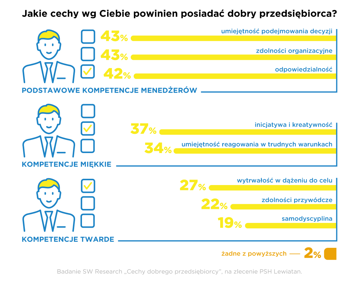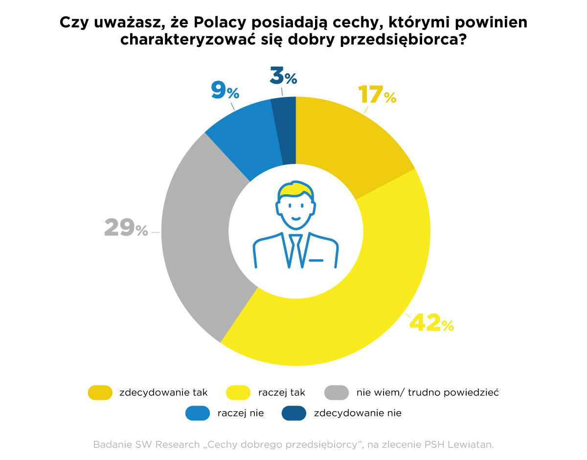 Marka polskiego przedsiębiorcy jest silna. Jak wynika z badania „Cechy dobrego przedsiębiorcy”, przeprowadzonego na zlecenie PSH Lewiatan, Polacy zdecydowanie przedsiębiorczość mają we krwi. Zapytani o to, jakie cechy powinien posiadać dobry przedsiębiorca odpowiedzieli, że są to decyzyjność (43%), umiejętność zarządzania (43%) i odpowiedzialność (42%). Zaraz za nimi istotną rolę grają inicjatywa i kreatywność (37%) oraz umiejętność reagowania w trudnych sytuacjach (34%). Na końcu rankingu cech dobrego przedsiębiorcy uplasowały się wytrwałość w dążeniu do celu (27%), zdolności przywódcze (22%) i samodyscyplina (19%). Jednak nawet ci, którzy mogą poszczycić się posiadaniem wszystkich wymienionych cech, w ostatnich czasach nie mają lekko.